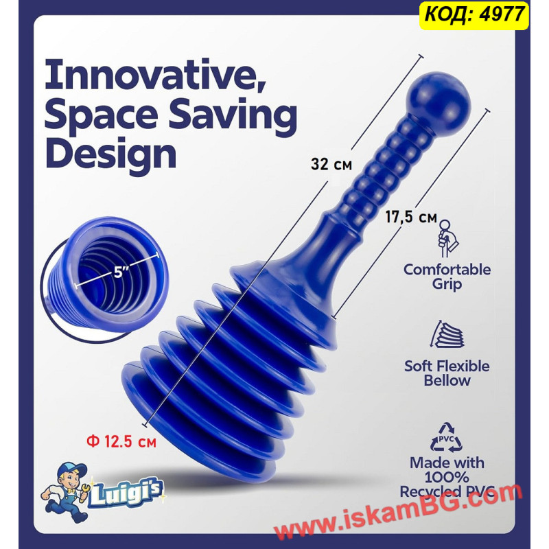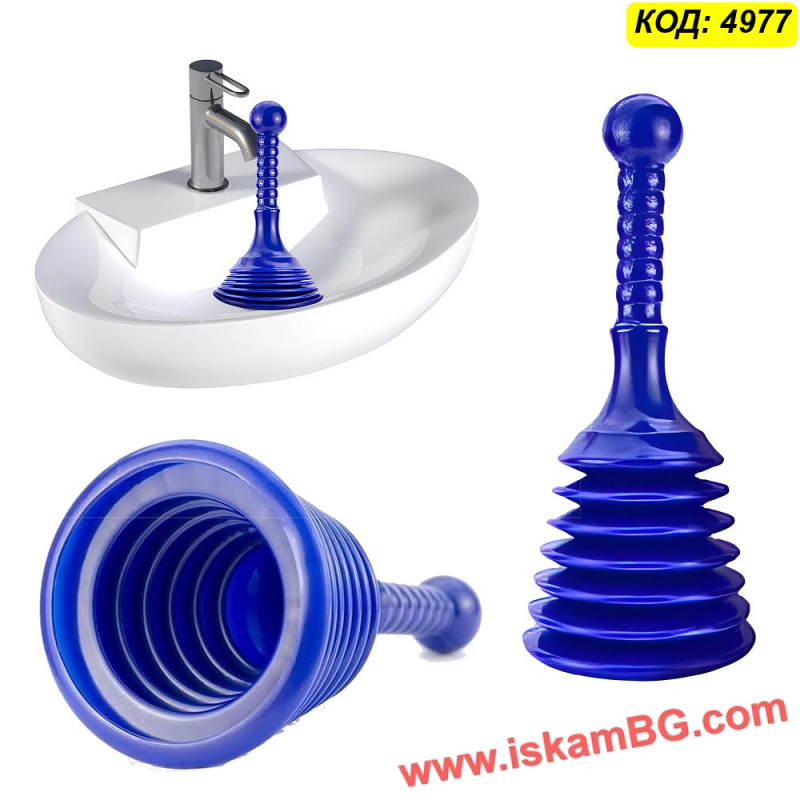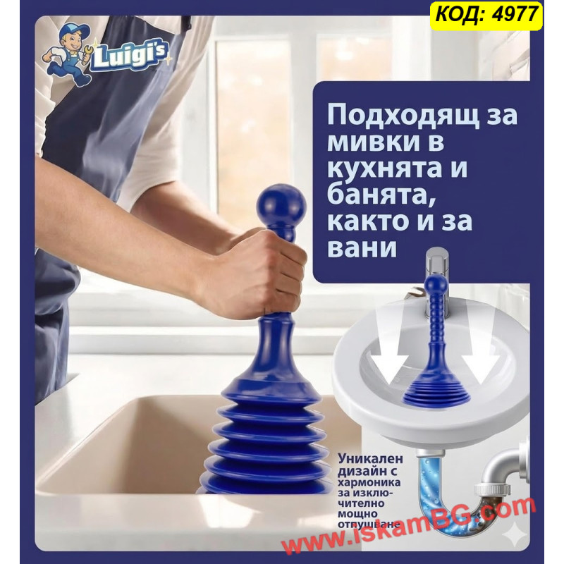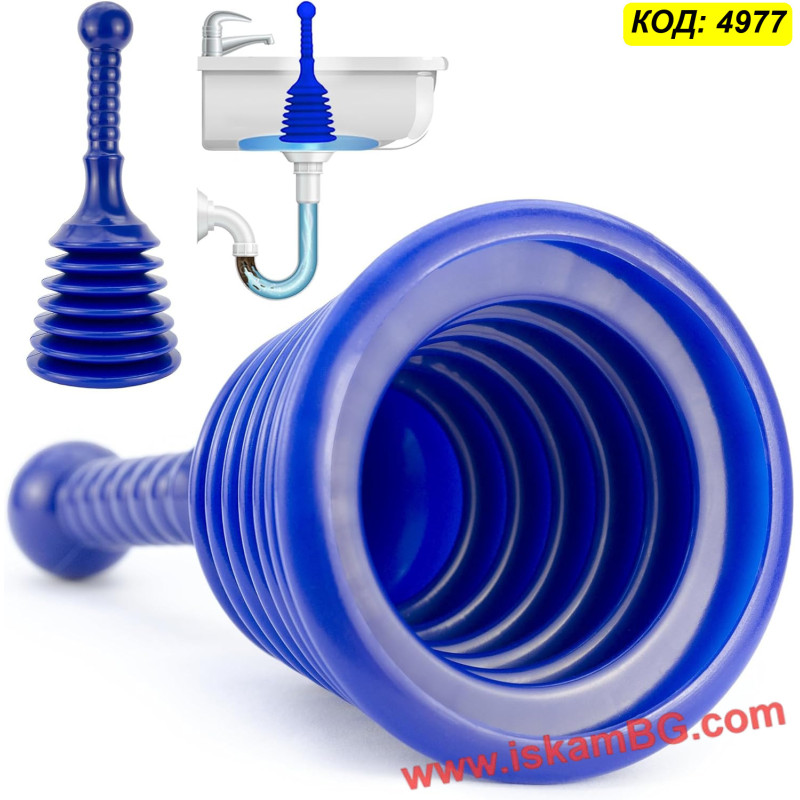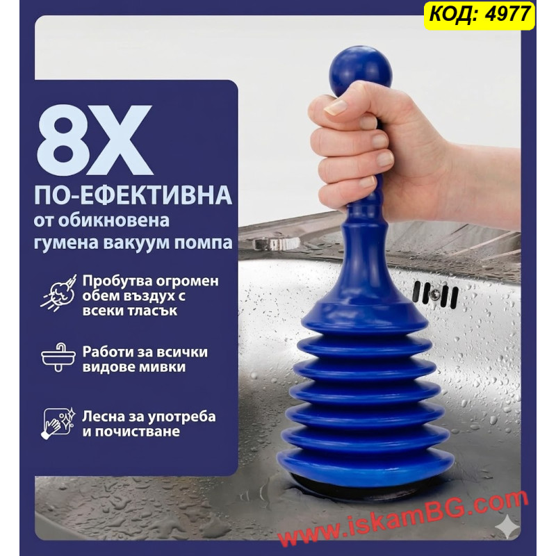 Благодарение на специалната хармоника / bellows конструкция, при натискане се изтласква голям обем въздух, което прави отпушването по-ефективно от стандартните модели. Формата е създадена така, че да осигурява добър захват върху отвора на сифона или канала и да подпомага по-силно концентрирано действие.