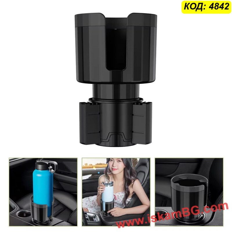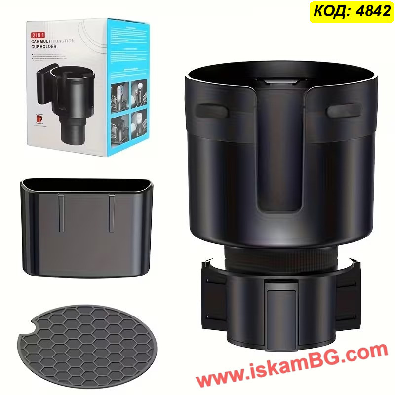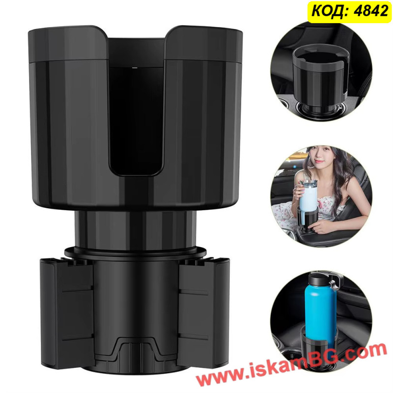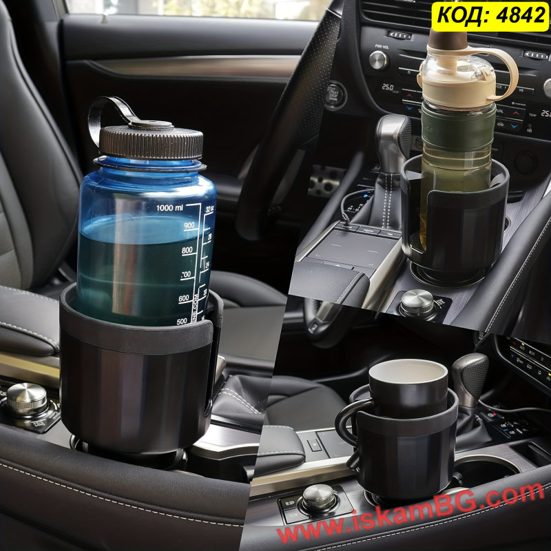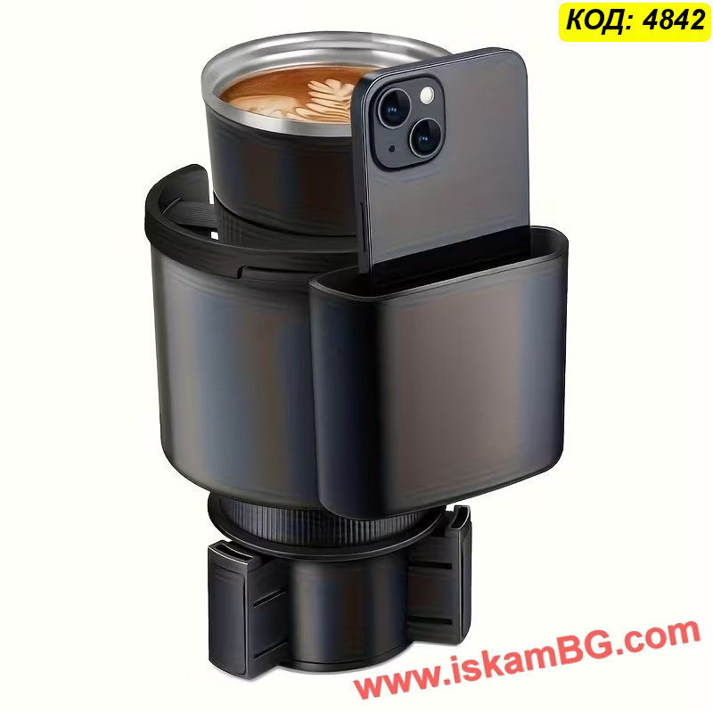 Този интелигентен адаптер превръща стандартния държач за чаша във вашия автомобил в мултифункционален органайзер с две гнезда. Благодарение на въртящата се на 360 градуса конструкция и разтягащите се челюсти на горната поставка, вече можете да поберете едновременно кафе, голяма бутилка вода, купа с храна или дори таблет/телефон, спестявайки ценно място в купето.