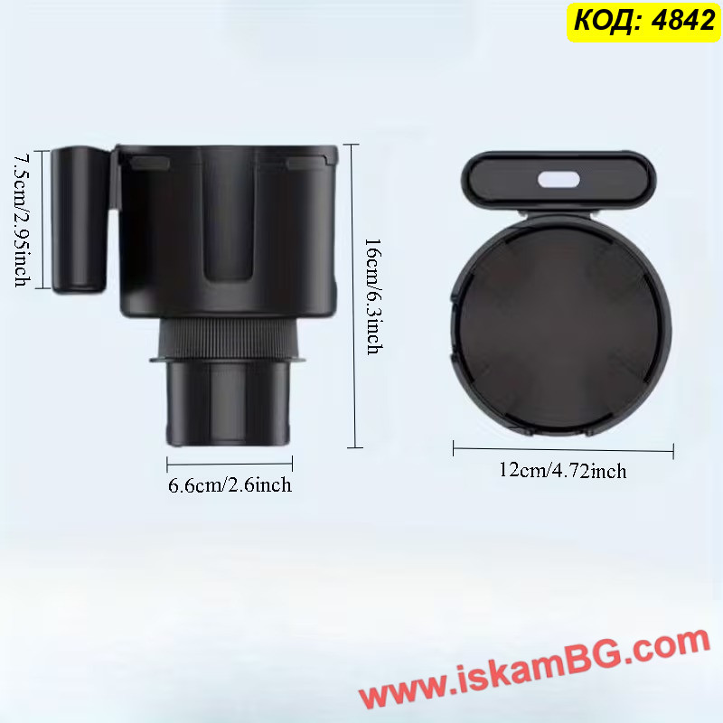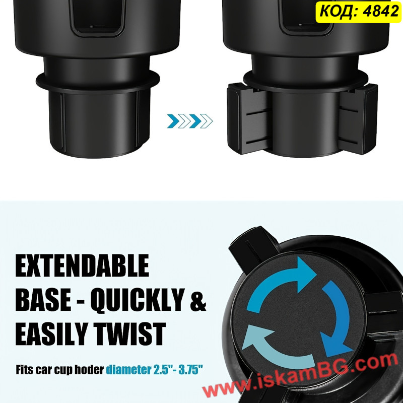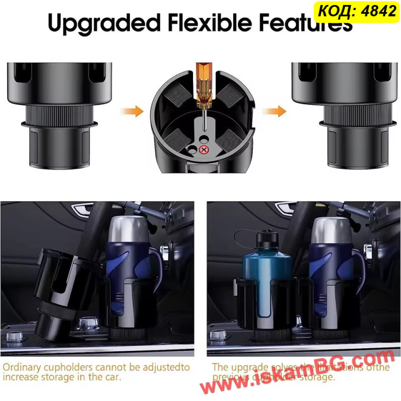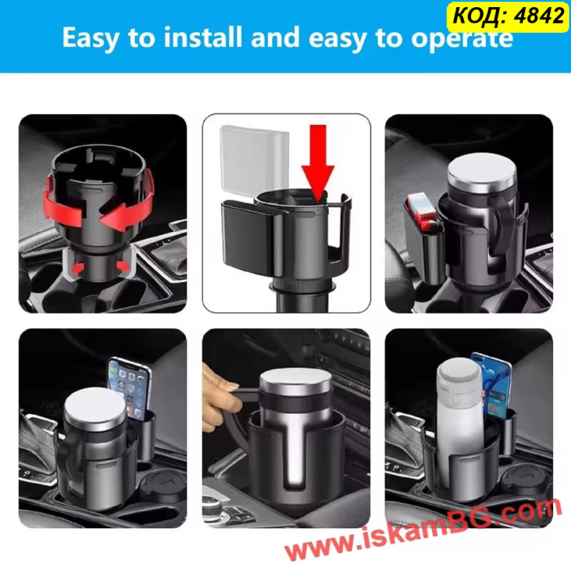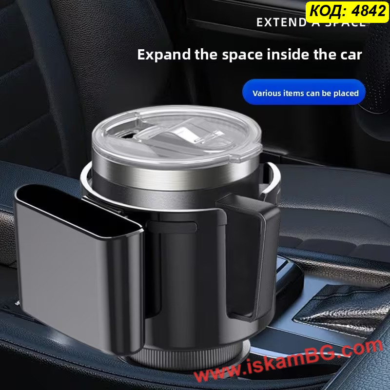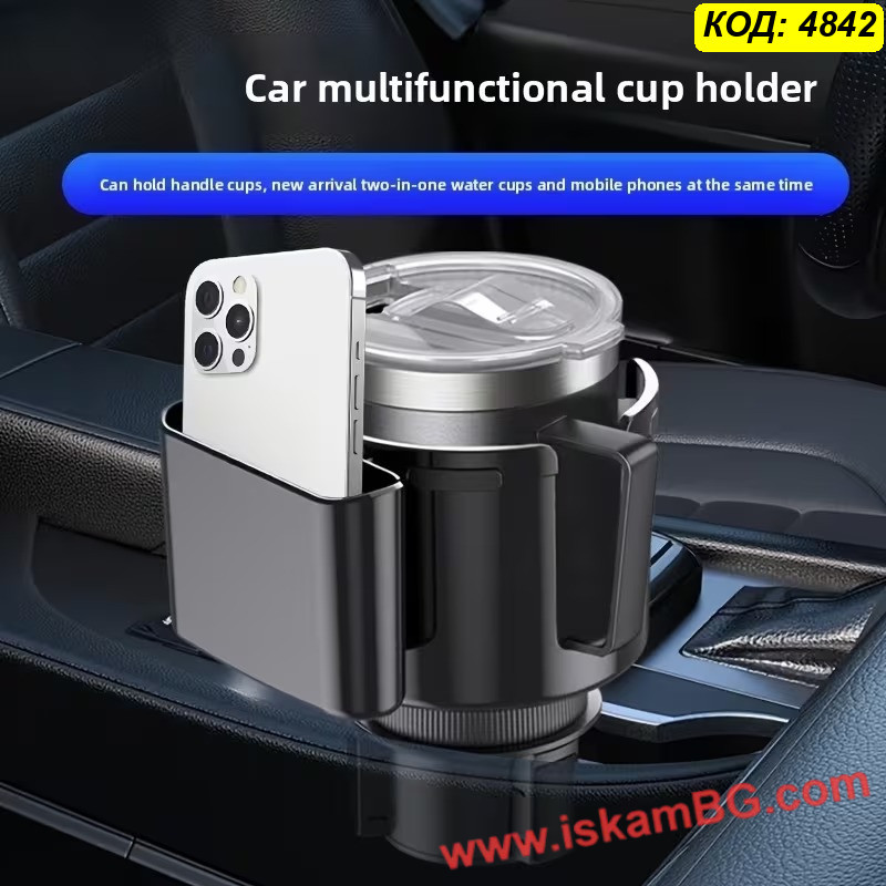 Този интелигентен адаптер превръща стандартния държач за чаша във вашия автомобил в мултифункционален органайзер с две гнезда. Благодарение на въртящата се на 360 градуса конструкция и разтягащите се челюсти на горната поставка, вече можете да поберете едновременно кафе, голяма бутилка вода, купа с храна или дори таблет/телефон, спестявайки ценно място в купето.