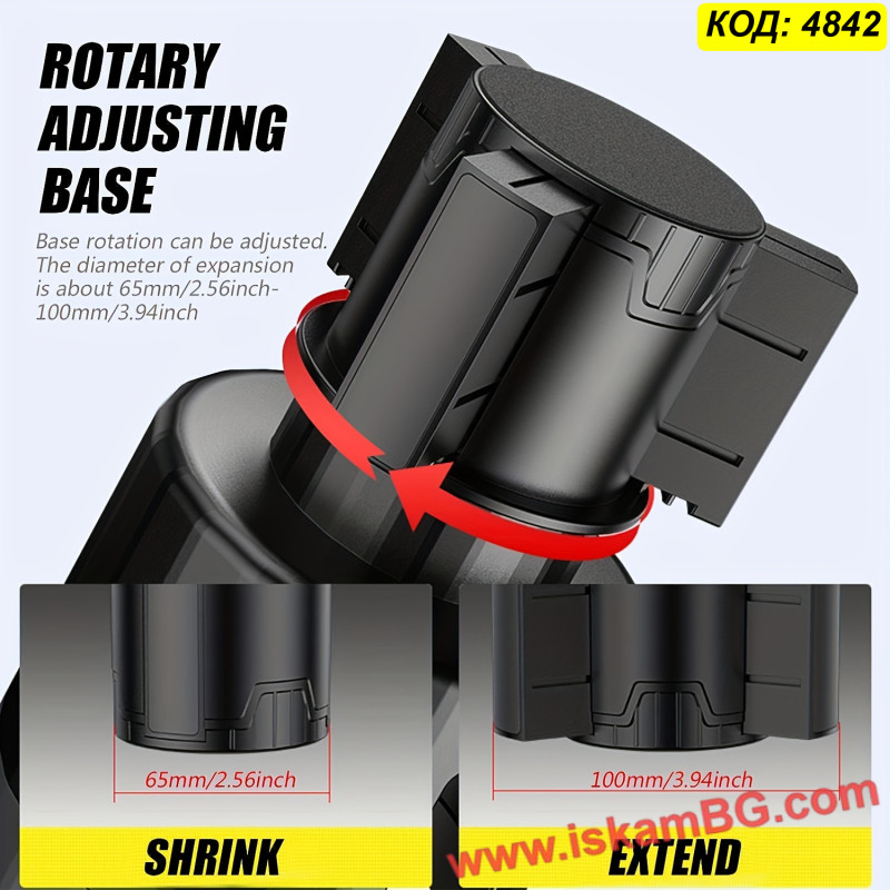 Защо да изберете този модел? Основното предимство е регулируемата основа, която се разширява чрез завъртане. Това позволява на държача да се "заклини" здраво във всяка кръгла поставка с диаметър от 65 мм до 100 мм, предотвратявайки досадното клатете или изпадане при завой.