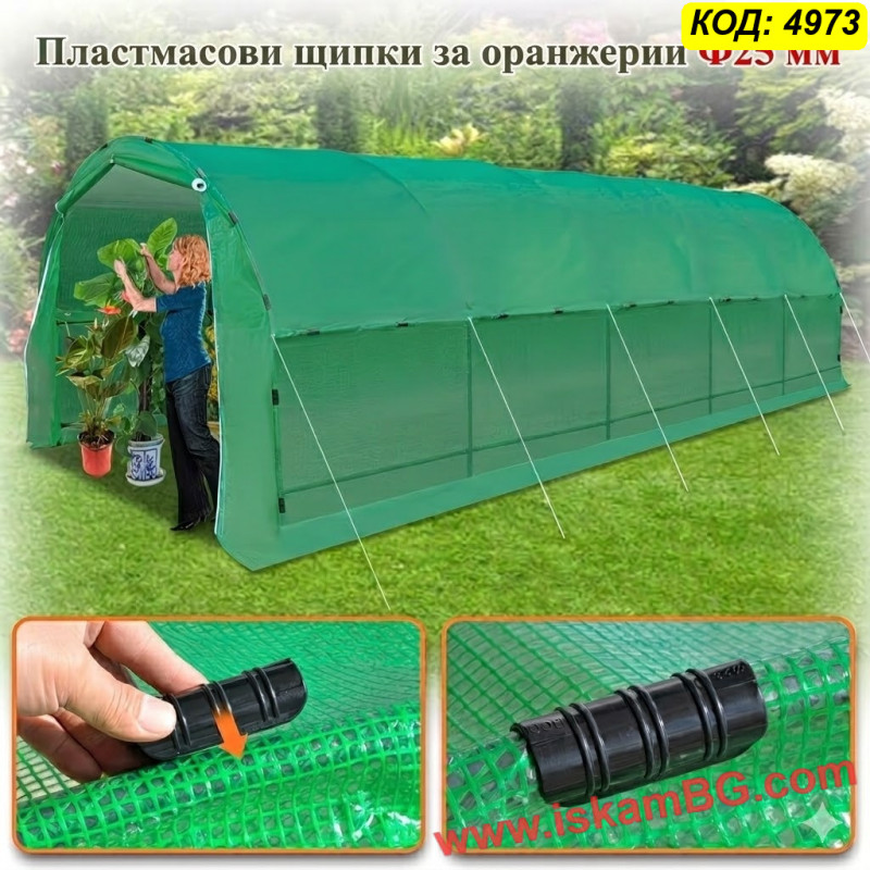 Тази пластмасова щипка за оранжерия Ф25 мм е предназначена за закрепване на найлон към тръби с диаметър Ф25. Подходяща е за широко разпространените зелени оранжерии, които масово се предлагат на пазара и обикновено са с тръба Ф25 мм. Щипката е с дължина 8 см и диаметър 2.5 см, което я прави подходящ избор за този тип конструкция.