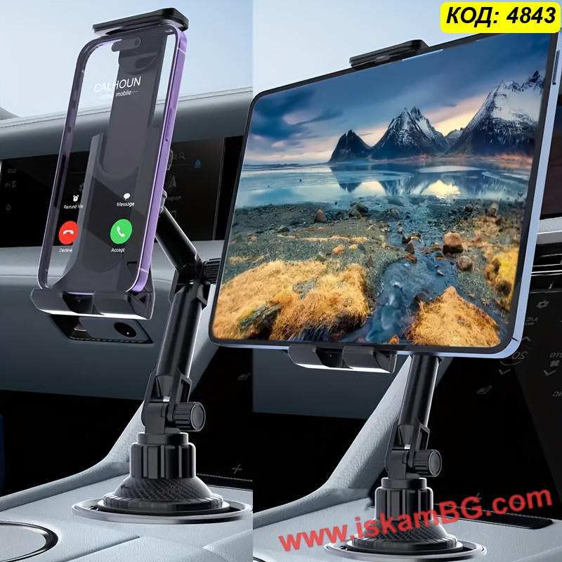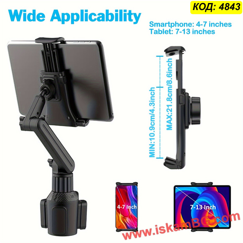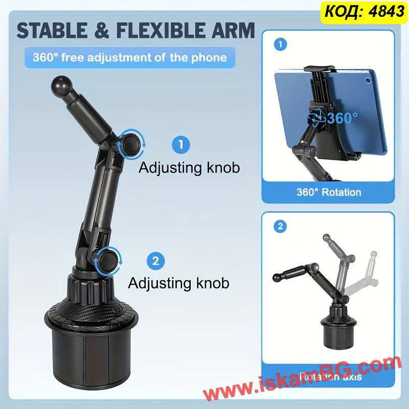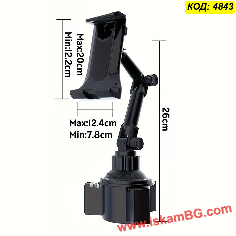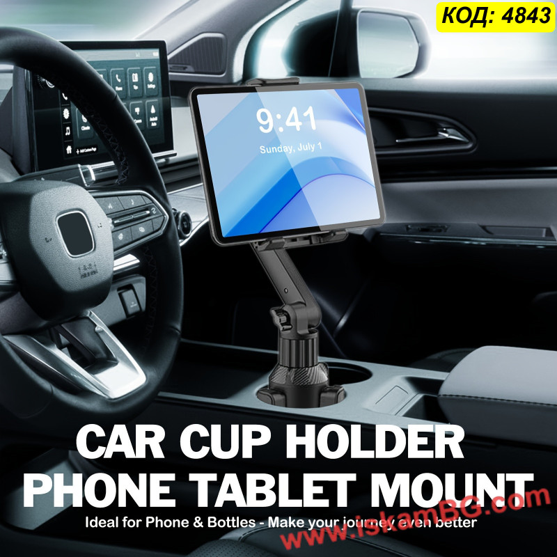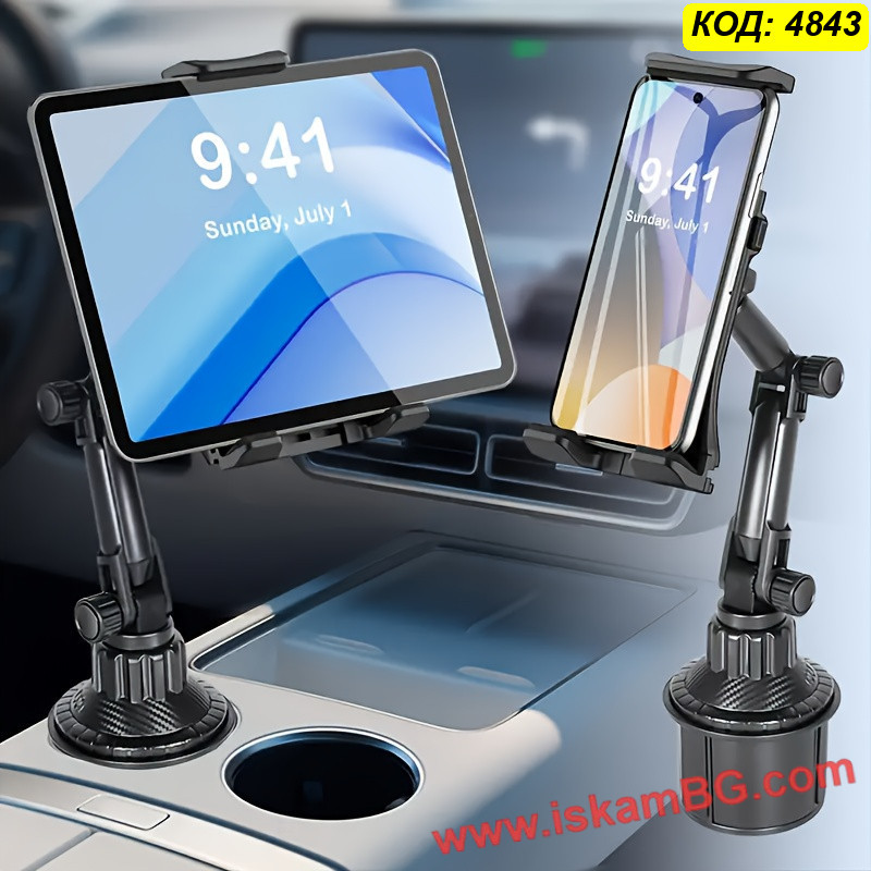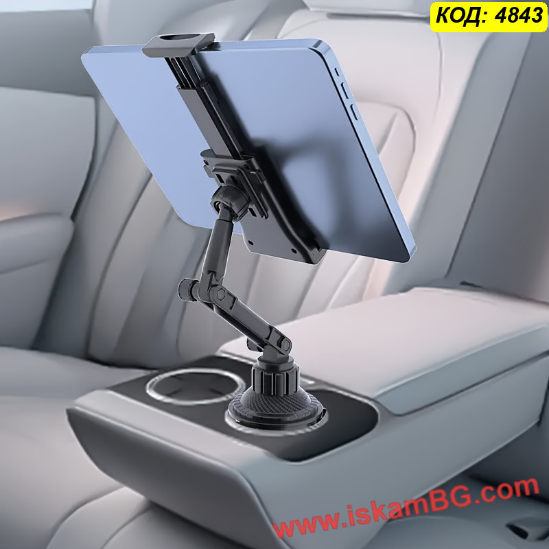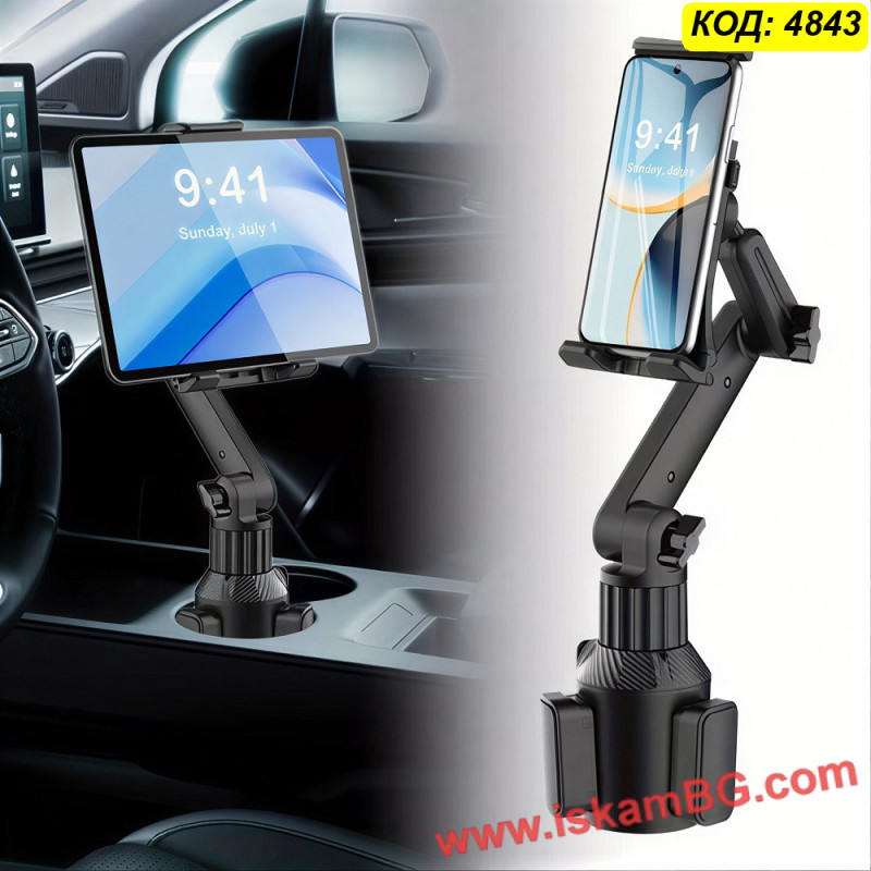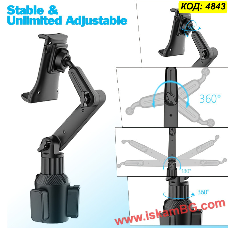 Стойка за кола за таблет и телефон с регулируемо дълго рамо и 360° въртене - захващане в поставката за чаша
