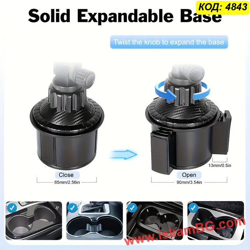 Универсален монтаж без инструменти: Благодарение на своя интелигентен механизъм, основата се разширява с едно завъртане, за да пасне плътно във всяка стандартна поставка за чаша. Това я прави идеална за лек автомобил, камион или джип.