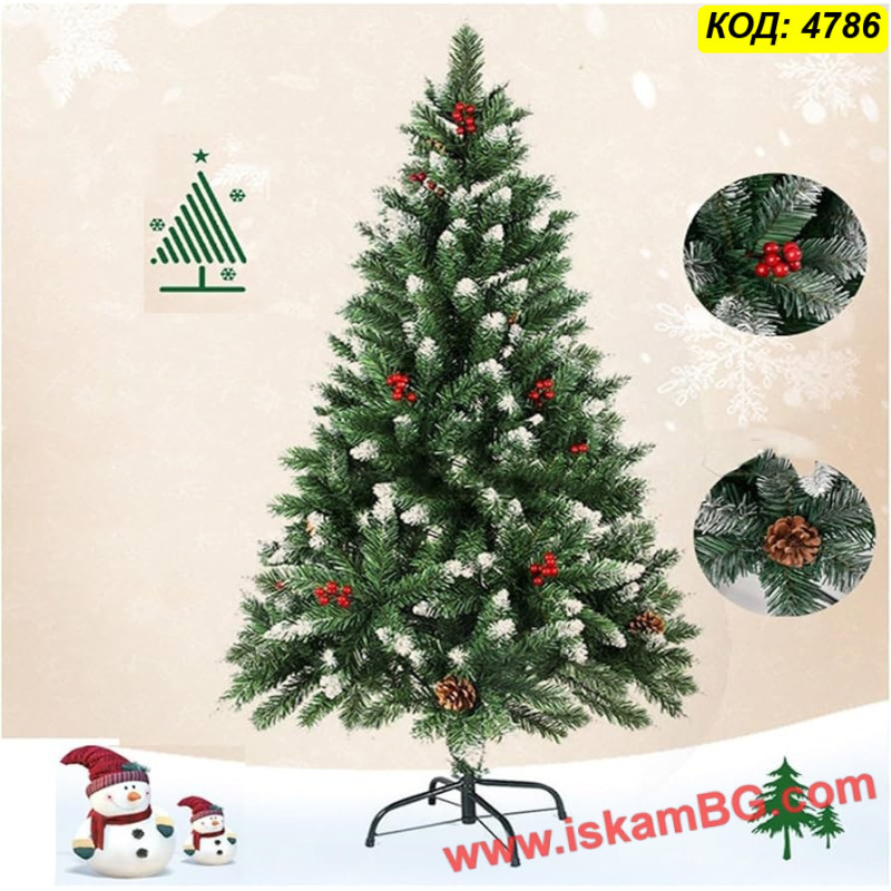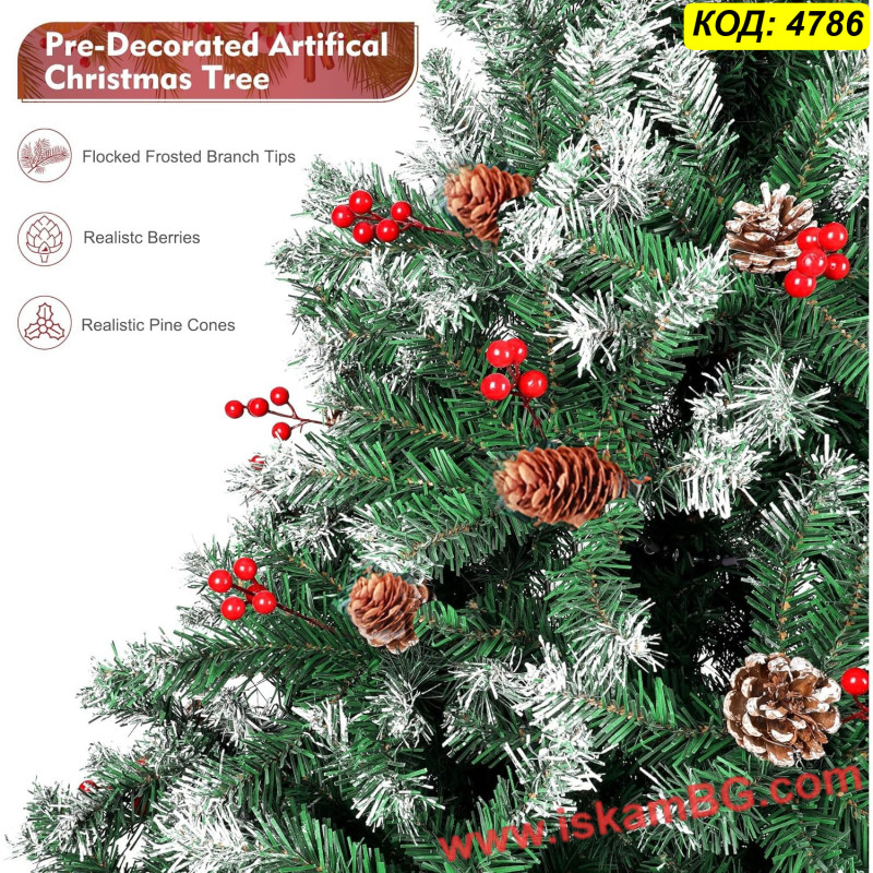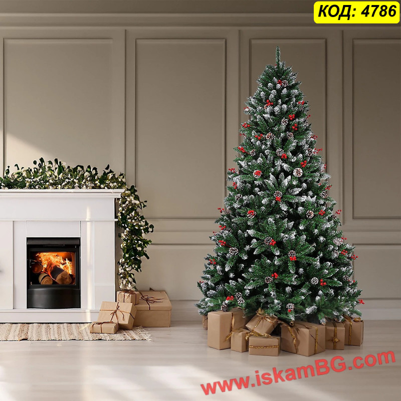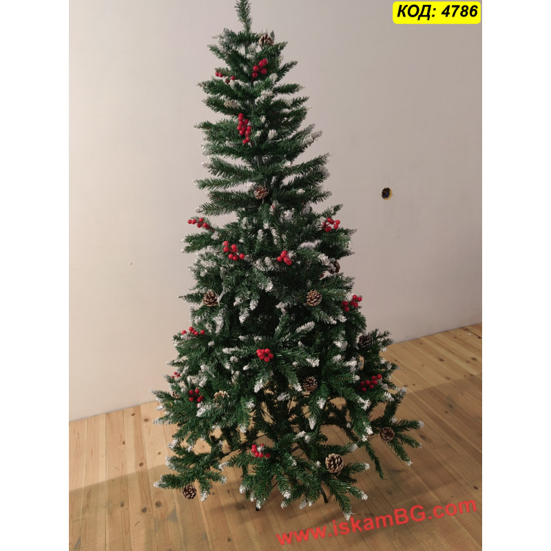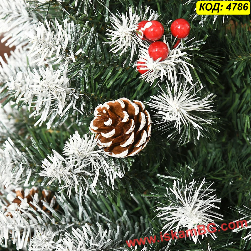 Декорация: Изкуствен сняг (флок), естествени шишарки, декоративни червени боровинки.
