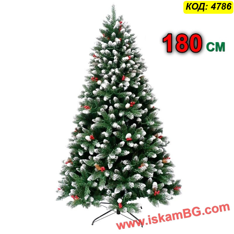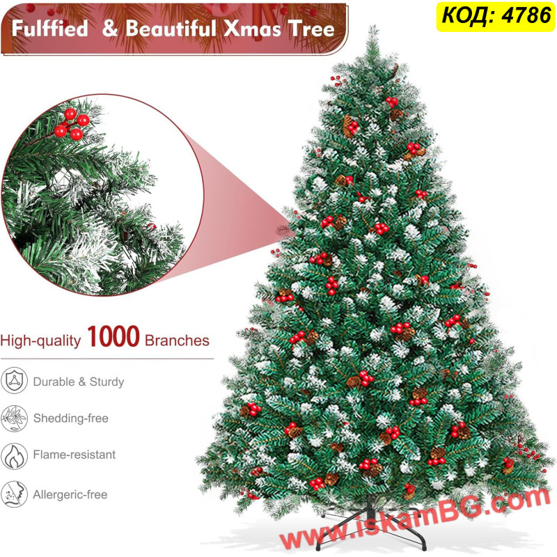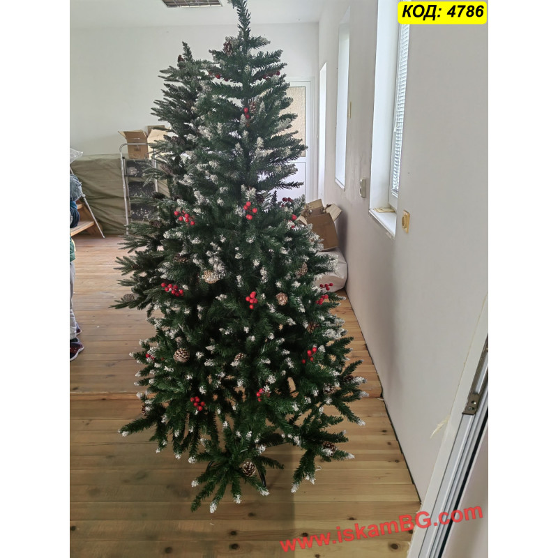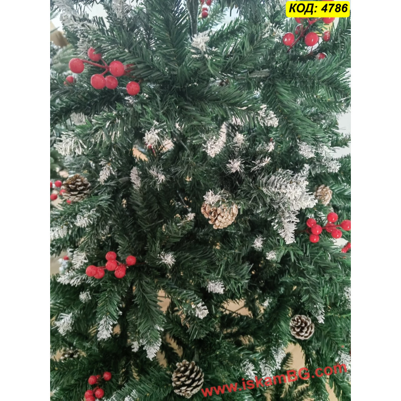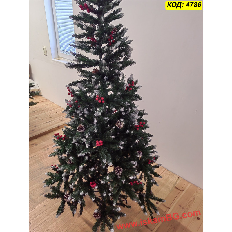 Декорация: Изкуствен сняг (флок), естествени шишарки, декоративни червени боровинки.