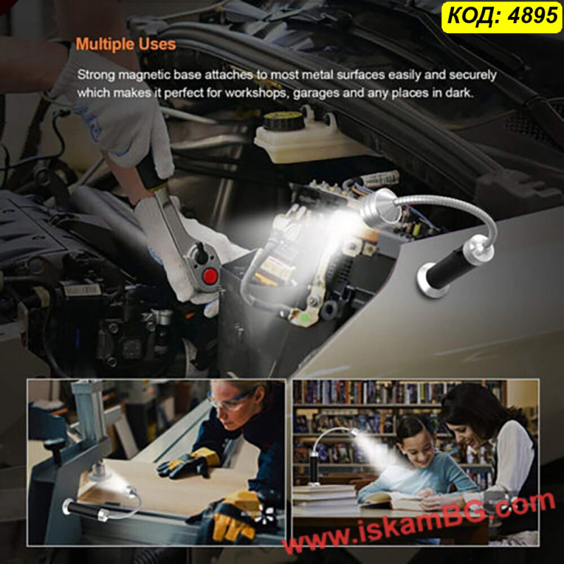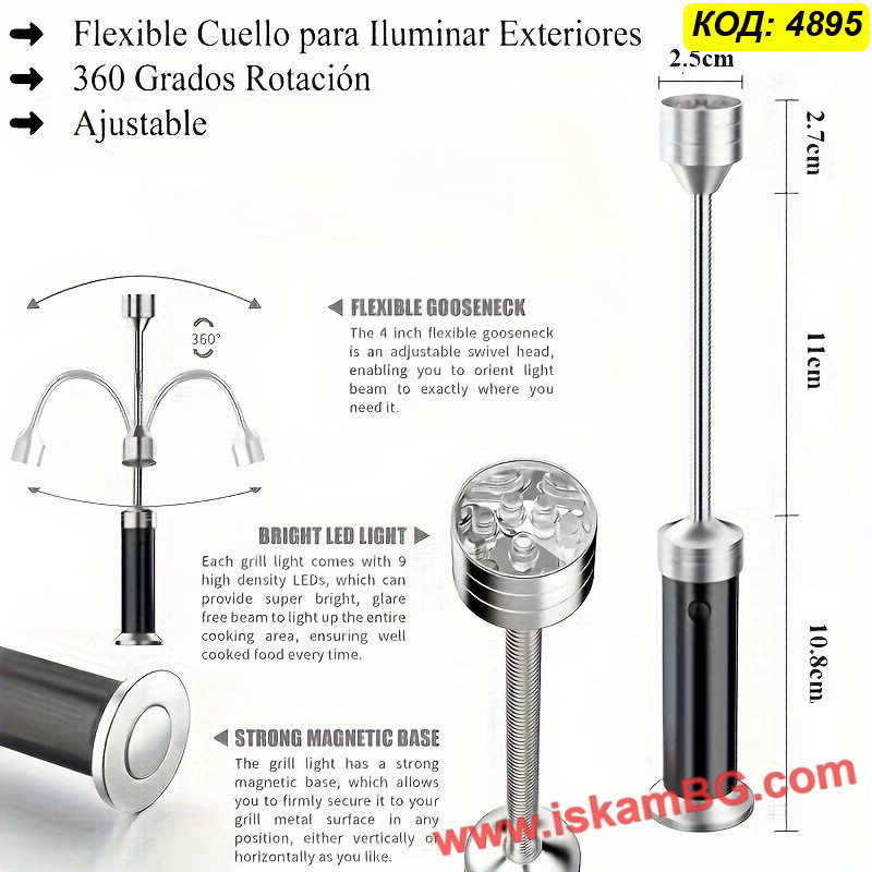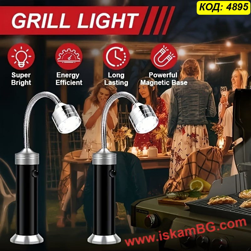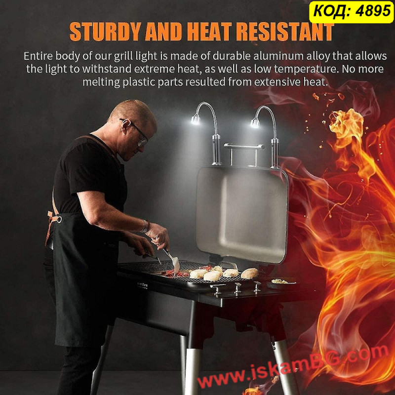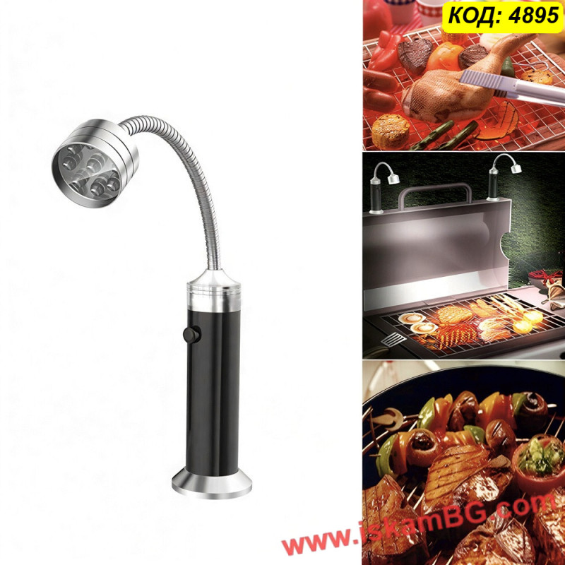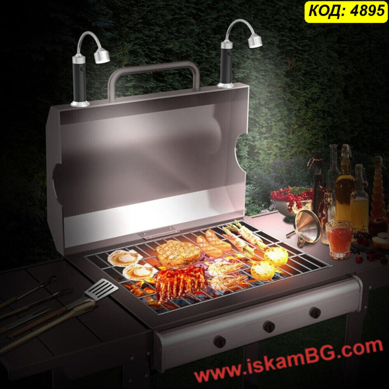 Устройството разполага с основа със силен магнит, който позволява сигурно закрепване към капака на барбекюто, страничните плотове или всяка друга метална повърхност. Гъвкавото метално рамо (тип "гуша") се върти на 360 градуса, позволявайки ви да осветите цялата площ за готвене, без да държите фенер в ръка.
