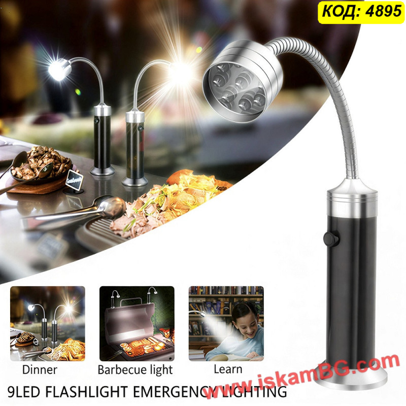 Светлината се осигурява от 9 икономични, но мощни LED диода, които гарантират отлична видимост, за да прецените готовността на храната. Освен за барбекю, лампата е изключително практична като помощно осветление при ремонт на автомобили, къмпинг или работа в работилница.