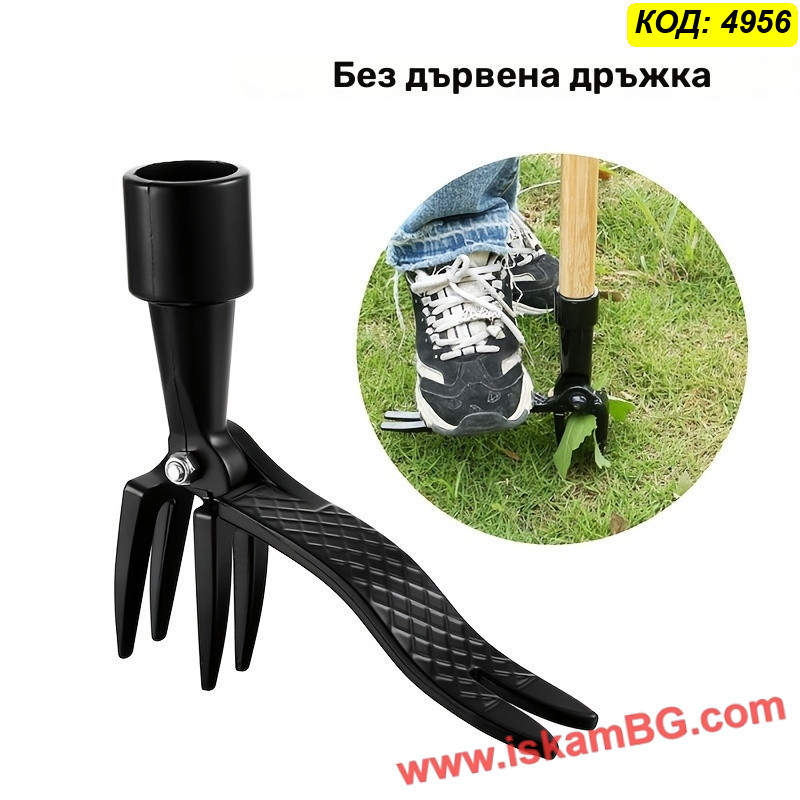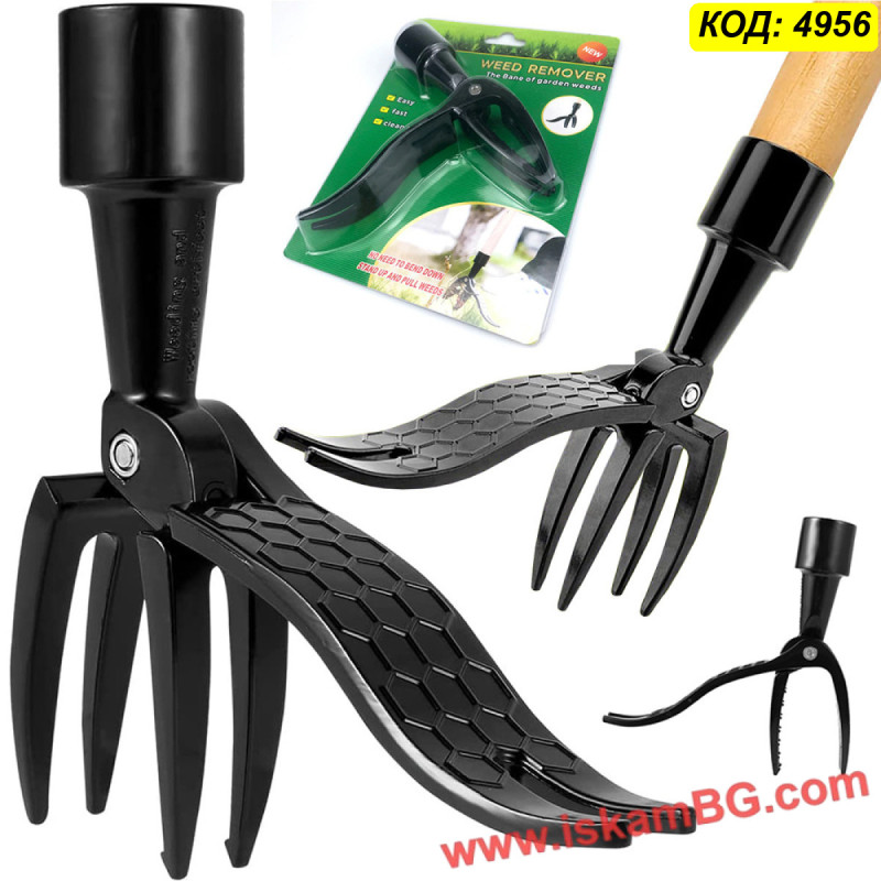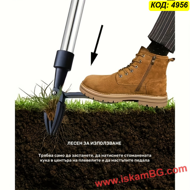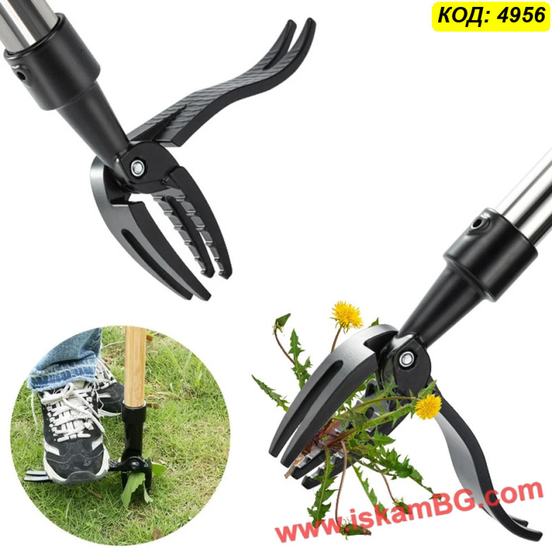 Металната глава с четири остри нокътя захваща плевела в основата, а педалът помага за по-лесно забиване в почвата. След поставяне над плевела, инструментът се натиска с крак и се издърпва, за да се извади растението с корена. Това го прави удобен избор за редовна поддръжка на двора, градината и местата, където често никнат глухарчета, бурени и трева.